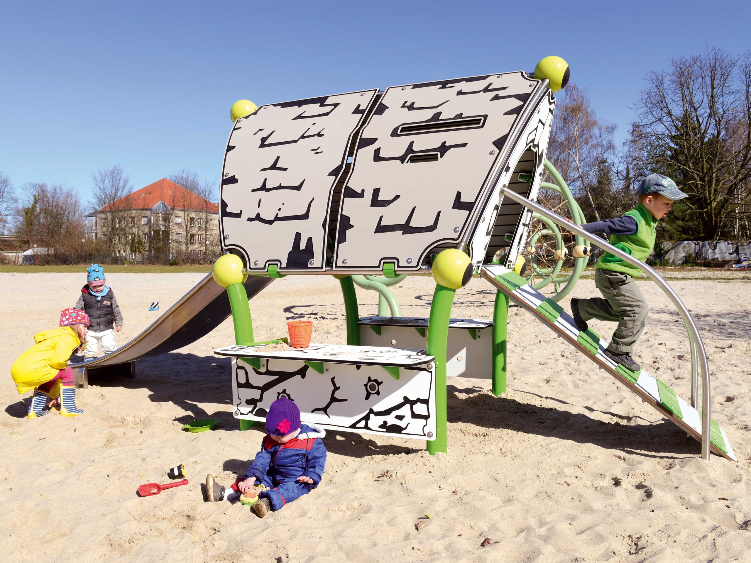 Folgerichtig setzt sich der Spielplatz aus Spielgeräten mit unterschiedlichen Anforderungsprofilen zusammen. Im Zentrum des Kleinkindbereiches steht das Spielhaus Roo M.03 der Spielgerätereihe Spooky Rookies, die speziell auf die Bedürfnisse von Kleinkindern unter 3 Jahren zur frühen psychomotorischen und sozialen Entwicklung ausgerichtet sind. So laden die Matschtische im unteren Bereich des Spielhauses zu Rollenspielen ein, im Rahmen derer Sprache und soziale Kompetenzen auf spielerische Weise gefördert werden. Eine Aufstiegsrampe macht es möglich, dass der obere Bereich des Hauses auch krabbelnd erreicht werden kann, bevor es über die kleinkindgerechte Rutsche wieder hinunter geht – eine Bewegungsform, die sich positiv auf die räumliche Wahrnehmung auswirkt und das Gleichgewichtsgefühl sowie die Koordinationsfähigkeiten der Kleinen verbessert.